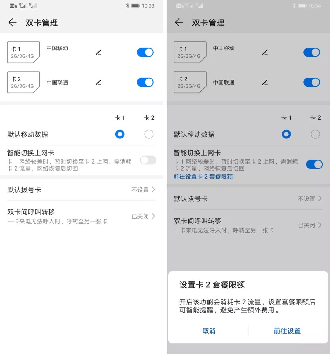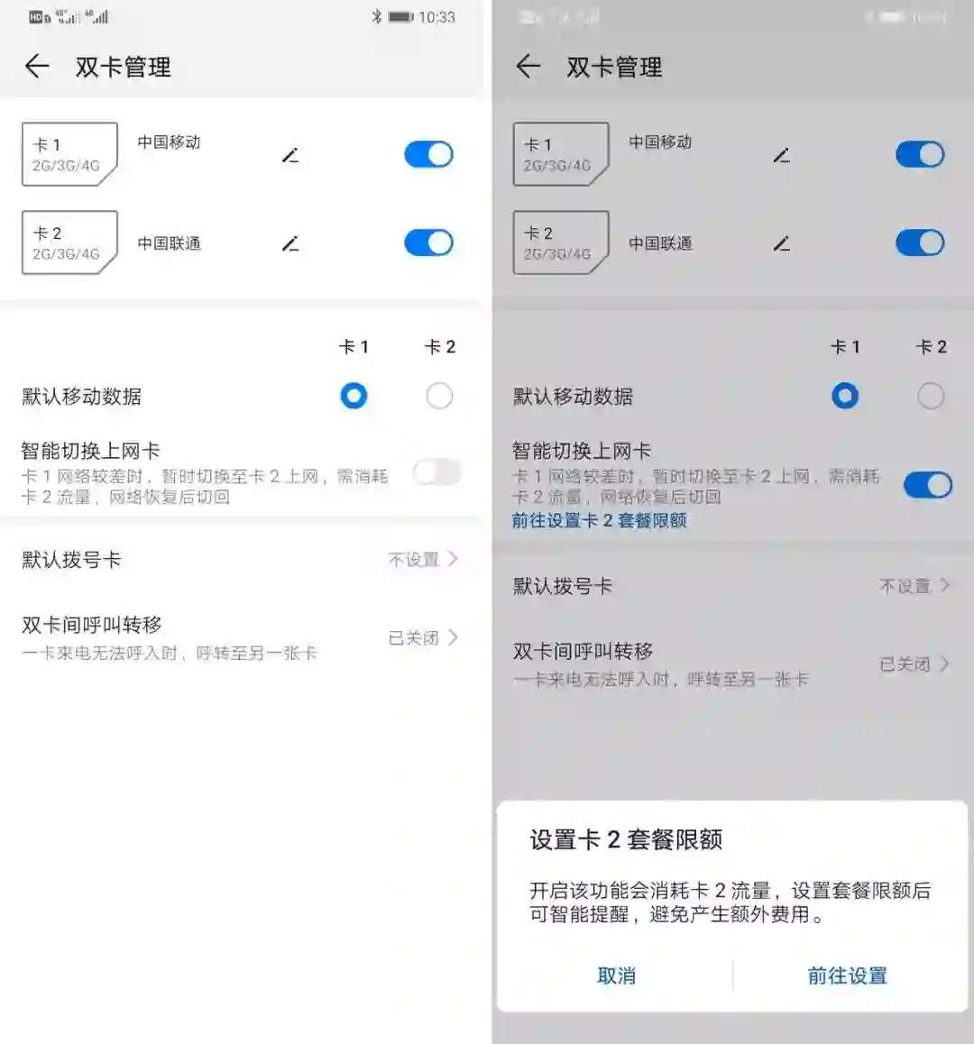 实测 EMUI 9.1 已经实装了这一功能,在设置中的双卡管理开启「智能切换上网卡」就可以体验。此外,你也可以为两张卡分别设定流量限额,避免流量超支的情况发生。另外,华为对用户场景做了比较全面的考量:如果前台运行的应用会消耗较多流量(如视频类应用),或者应用本身对 IP 地址较为敏感(如银行、支付类应用),这一功能将不会被自动启用。