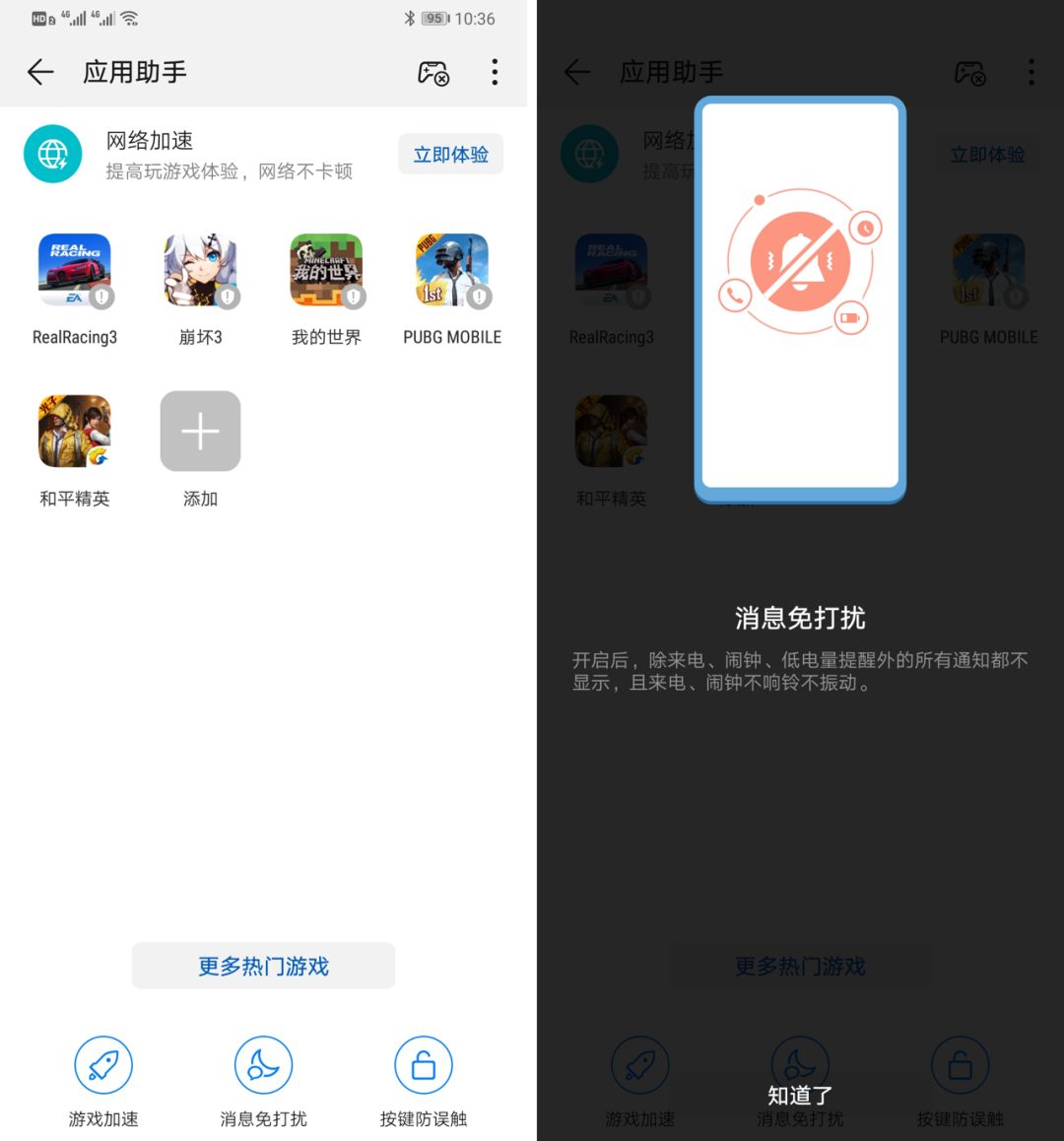 除了我们在测试部分提到的性能提升,这个「应用助手」还提供了一系列实用功能,包括按键防误触、网络加速、游戏加速、消息免打扰等。在开启游戏加速后,系统会优先保证游戏的性能表现,让其运行体验更加稳妥。