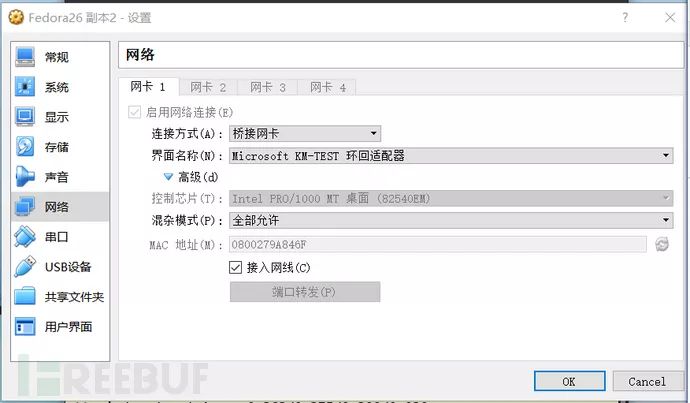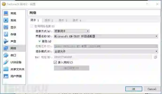 (1)我使用的虚拟机是Oracle VM VirtualBox,首先配置网络,都设置为桥接网卡,界面为环回适配器,混杂模式为全部允许,使两台虚拟机之间可以互相通信: