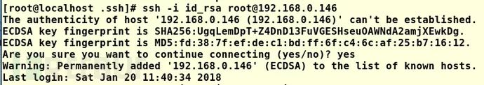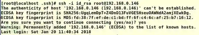(13)在主机B使用ssh免密登录主机A:ssh -i id_rsa root@192.168.0.146,成功登录: