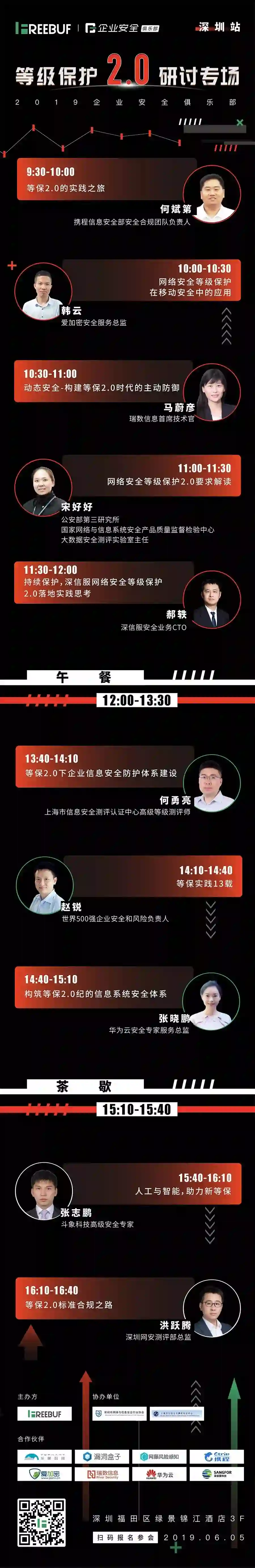 6月5日,「FreeBuf 企业安全俱乐部」系列沙龙活动「等级保护2.0研讨专场」将在深圳盛大开幕。届时,活动现场将邀请测评机构、企业安全负责人、厂商代表等知名专家,以不同行业、不同企业特征为基础,助力企业等保落地、安全环境构建,推动我国网络安全保障体系建设。