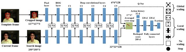 ·SiamFC 网络结构:在每一层——获取实例相应的分数,然后将其反馈给Q-net,以做出判断