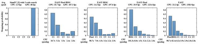 ·横坐标为不同的特征层决策,纵坐标为在此特征层判断停止的概率。对于5个具有不同特征梯度的模型, 我们显示 CPU和 GPU (顶部)的平均速度, 以及每个层 (底部) 的基线 SiamFC (1.9 fps) 的 CPU 加速率。