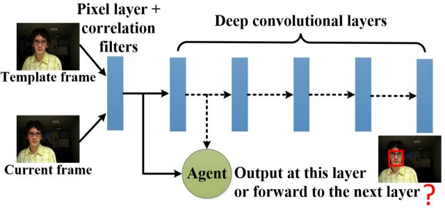 本文的目标是在不丢失精度的情况下, 提高深度跟踪器的速度。我们基本的想法是采取一种自适应的方式, 使用低成本的特征 (如像素值) 处理简单帧, 而具有挑战性的帧,则用不变的但代价很高的深层特性来处理。我们将自适应跟踪问题看成一个决策过程, 并让一个智能体来决定是在早期时将其定位成高度自信可处理的对象, 还是让其进入网络的后续层进行处理。这极大程度上降低了那些具有明显对象或者缓慢移动目标的简单帧的前馈成本。我们以强化学习的方式线下训练智能体, 并进一步证明学习所有深层 (以便提供良好的特征给自适应跟踪功能) 可以实现在一个单一的CPU上达到接近实时平均跟踪速度 23 fps(每秒帧数),同时达到极好的效果。 我们的方法在50% 的时间内都提供了100倍的加速, 展现出了这种自适应方法巨大的潜力。