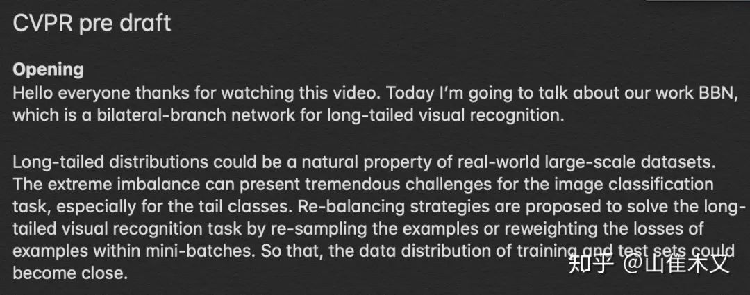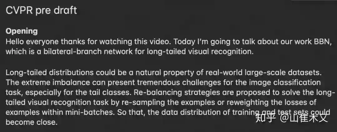 写好一份精炼的讲稿,由于正常情况下人一分钟能说130~150词,所以讲稿的长度完全由视频要求的时长决定,由于CVPR视频限时5分钟,我写的就是700词左右的讲稿;