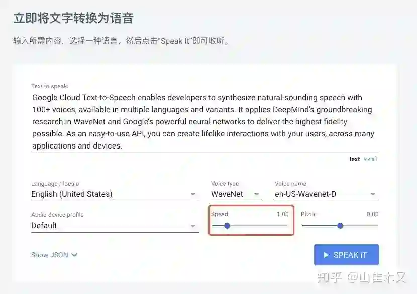这里推荐谷歌家的text-to-speech,谷歌牛逼我只能说,太逼真啦!试用功能就够用啦。下面图中的红框可以调节语速,这个功能可以让你把稿子的时长刚好控制在5分钟,也是非常节省时间的一步,不需要自己瞎琢磨语速。