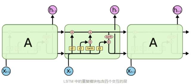 下图为改进了的LSTM模块,虽然 同样是这样的结构,但是重复的模块拥有一个不同的结构。不同于 单一神经网络层,这里是有四个,以一种非常特殊的方式进行交互。