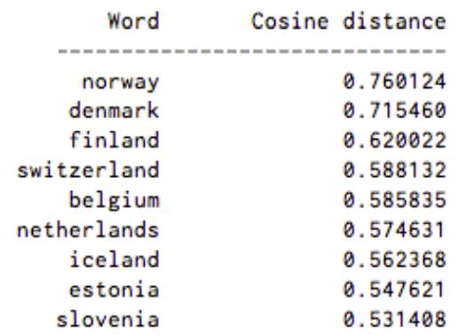 作者从https://deeplearning4j.org/word2vec上扒来了几张图,可以直观地看一看 Word2Vec 模型的效果。下图罗列出了在词集 V 中,和“Sweden”中距离最近的9个词: