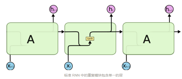 LSTM 通过刻意的设计来避免长期依赖问题。上图是一个普通RNN模块,所有 RNN 都具有一种重复神经网络模块的链式的形式。在标准的 RNN 中,这个重复的模块只有一个非常简单的结构,例如一个 tanh 层。
