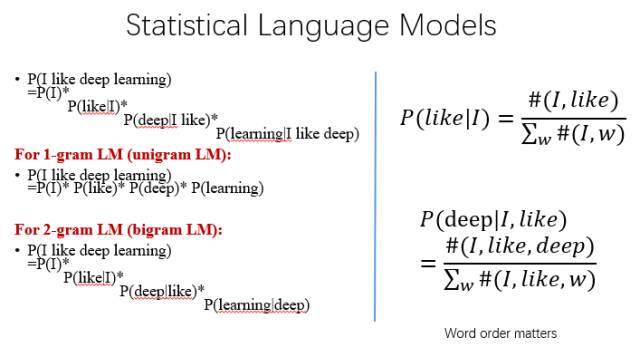 下图是最基本的统计语言模型。这是一个计算"I like deep learning."这句话出现概率的例子。