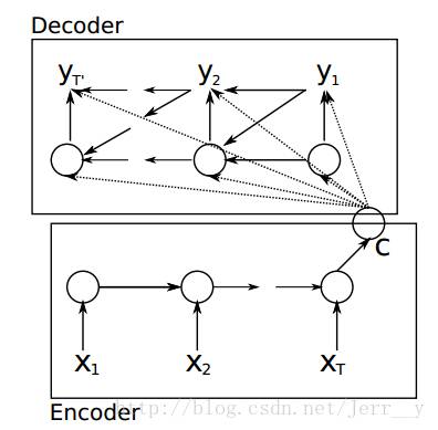 根据Cho et al.的论文,其中 Encoder 部分就是一个RNNCell (RNN, LSTM, GRU, etc.)。如下图,每个 timestep, 我们向 Encoder 中输入一个词向量,直到句子的最后一个输入X_T。然后,Encoder 输出整个句子的语义向量 c(一般 c=h(X_T))。因为 RNN 的特点就是把前面每一步的输入信息都考虑进来了,理论上这个 c 就能够把整个句子的信息都包含了。