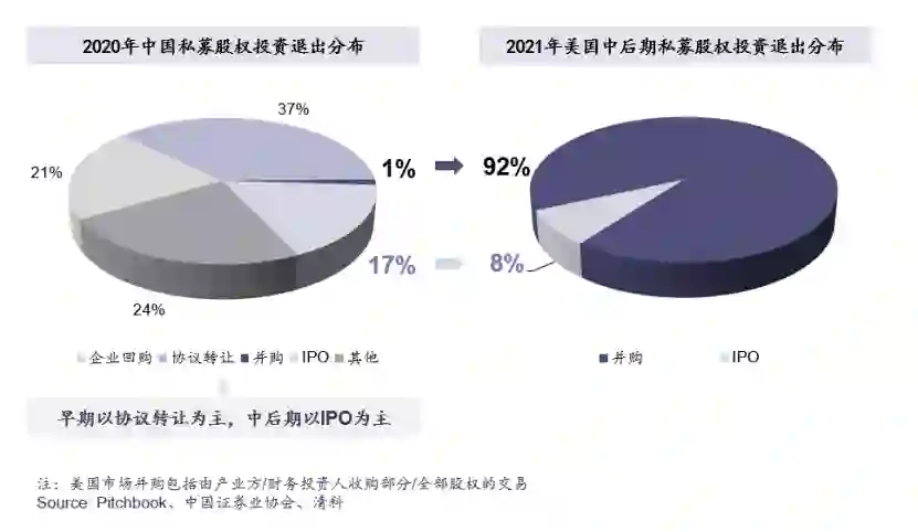 最后,在退出上,产业并购或成为主要退出方式之一。以美国退出市场为例,其中后期投资多以并购方式退出,其中,约有六成为产业方并购。LP对DPI(Distribution over Paid-In,投入资本分红率)的要求促使GP寻求多元化退出渠道,并购将成为主流退出方式。而并购方除了并购基金外,大的产业投资人因为对产业生态发展的需要,成为潜在最大的买方之一。