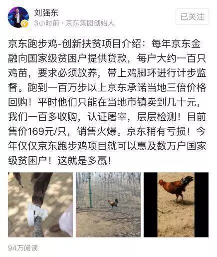 2017年5月,刘强东在头条号上晒出了京东跑步鸡的扶贫项目介绍,刘强东提到:京东养的跑步鸡要求必须放养,并且每只鸡的脚上都有计步器监督,跑够一百万步以上的鸡,京东承诺以当地三倍的价格回购。