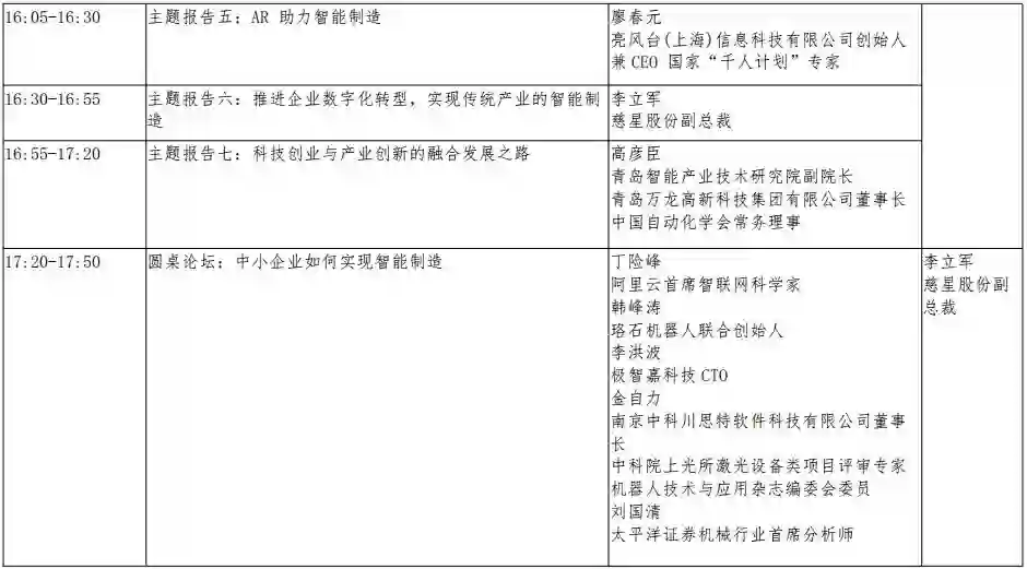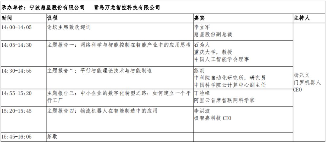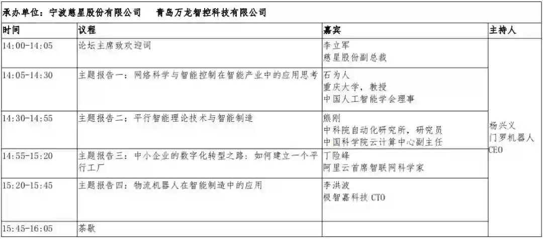 目前智能制造平行论坛全体嘉宾信息及报告内容已出炉,包括:重庆大学教授、中国人工智能学会理事石为人,阿里云首席智联网科学家丁险峰,慈星股份副总裁李立军,中科院自动化研究所研究员、中国科学院云计算中心副主任熊刚,亮风台(上海)信息科技有限公司创始人兼CEO、国家“千人计划”专家廖春元,青岛智能产业技术研究院副院长、青岛万龙高新科技集团有限公司董事长、中国自动化学会常务理事高彦臣,极智嘉科技CTO李洪波,珞石机器人联合创始人韩峰涛,以及南京中科川思特软件科技有限公司董事长金自力。欢迎更多优秀智能制造企业参会,共享智能科技盛宴。