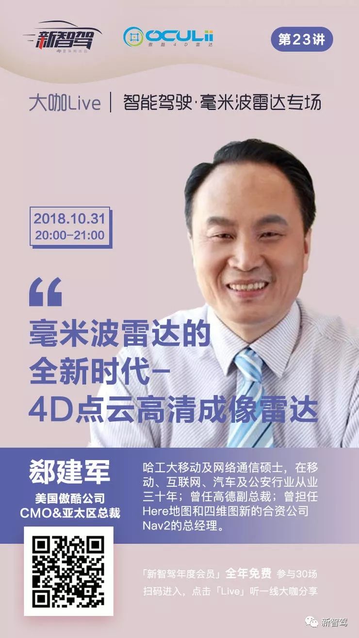 10 月 31 日(周三)晚 8 点,【大咖Live】第 23 期智能驾驶·毫米波雷达专场,我们邀请到Oculii CMO 郄建军详细解析“毫米波雷达的全新时代—4D点云高清成像雷达”。照例,本次分享对新智驾会员免费开放。