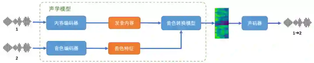 同基于深度学习的语音合成一样,声音转换的模型也由声学模型(acoustic model)和声码器(vocoder)组成。声学模型通过内容编码器从输入音频中提取出发音内容序列,并通过音色编码器从参考音频中提取出音色特征,最后通过声音转换模型生成带有输入音频内容和参考音频音色的频谱;声码器负责将声学模型生成的频谱还原为能够被设备直接播放的音频采样点: