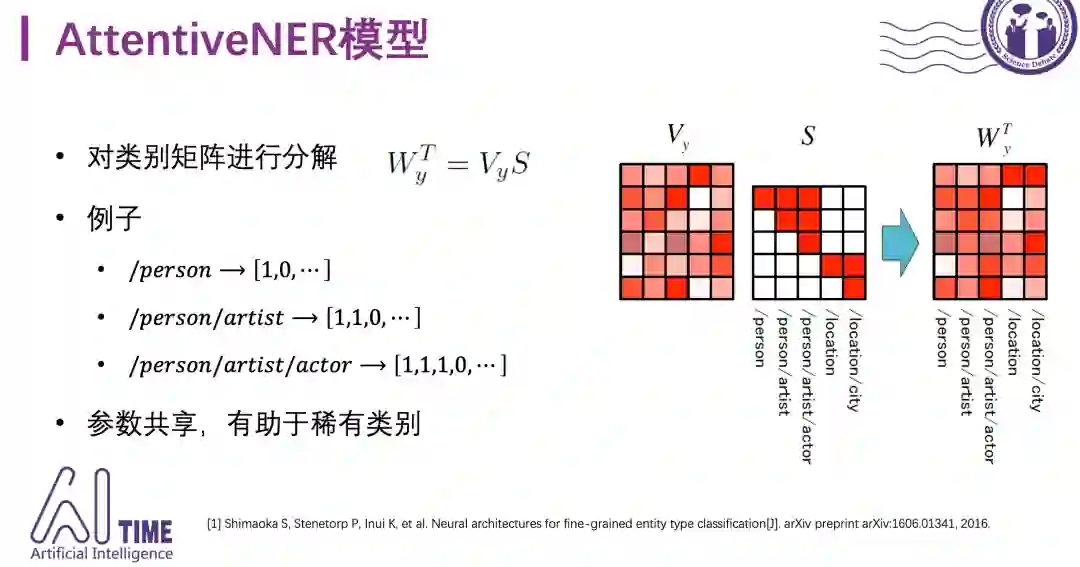 AttentiveNER采用了比较简单的方式来处理类别之间的层次关系。V_y表示要学习的参数矩阵,S是一个稀疏矩阵,按照层级进行编码,比如Person第一个位置为1,/person/artist前两个位置为1,这样有助于参数共享,同一层的类别可以共享父节点的表示,对于那些训练数据比较少的类别有帮助。