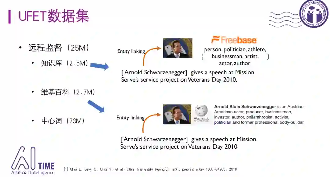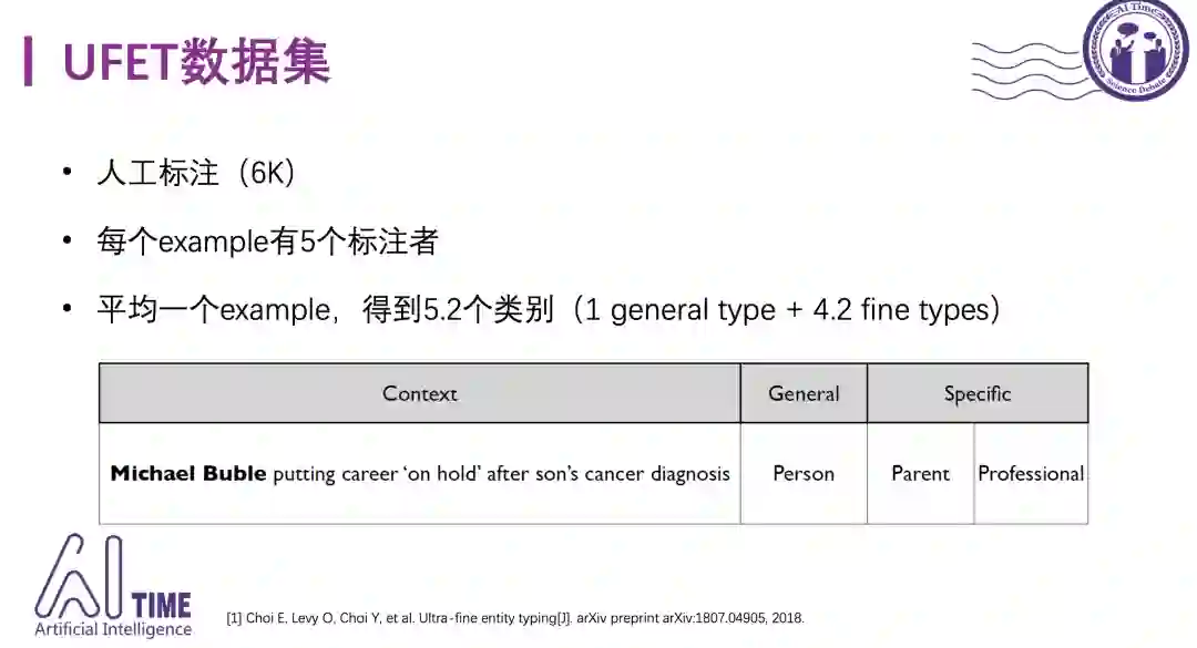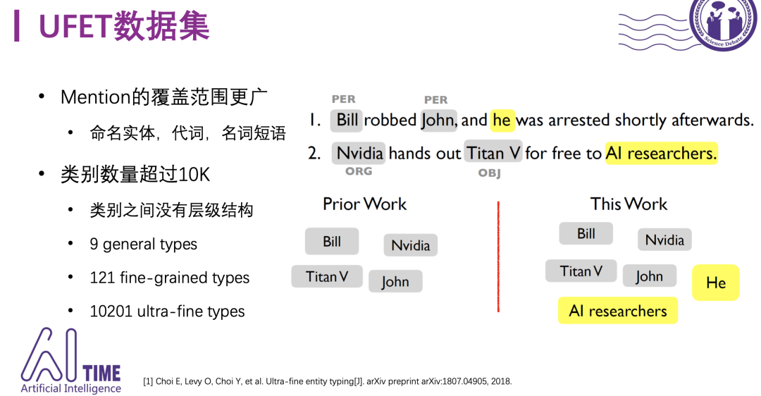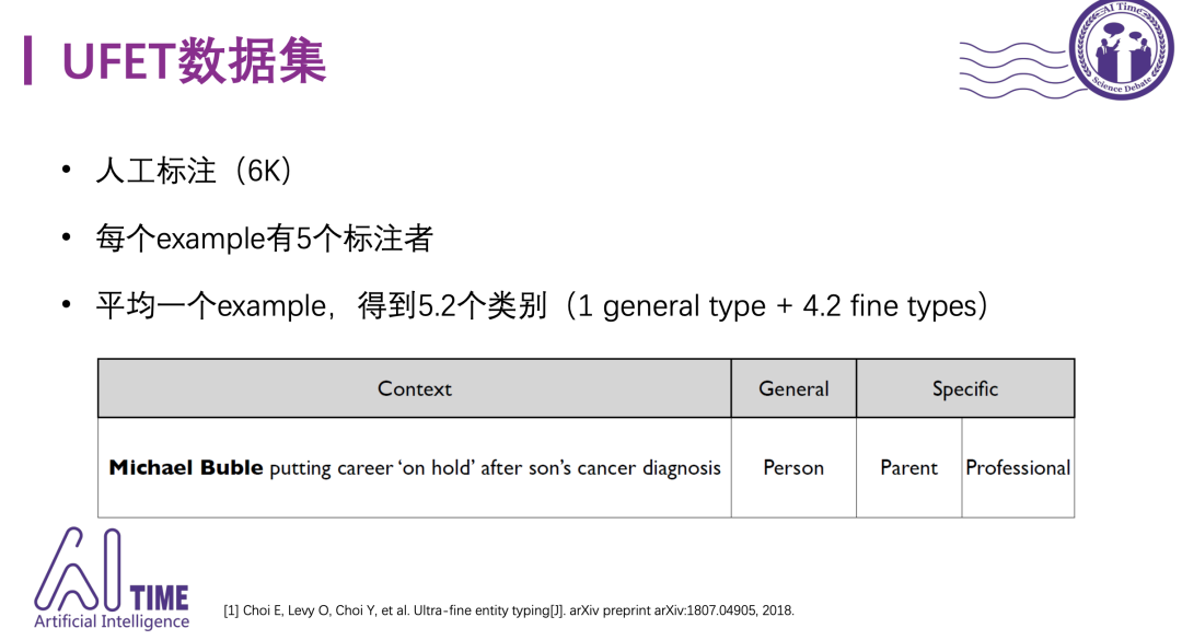 ACL-2018提出的UFET数据集近两年得到了广泛的关注。这个数据集的特点是类别数量特别多,包含9个粗粒度类别,121个细粒度类别和超过10K的特别细粒度类别,mention的覆盖范围也不局限于命名实体,还包括代词和名词短语,图中黄色部分是前面工作没有覆盖到的,增加了He这种代词、AI researcher这种名词短语,这些在知识库中一般找不到对应的实体。Mention和type的覆盖面增大,给细粒度实体分类任务带来了更大的挑战。