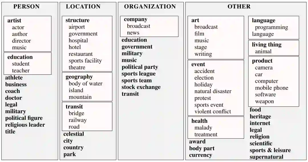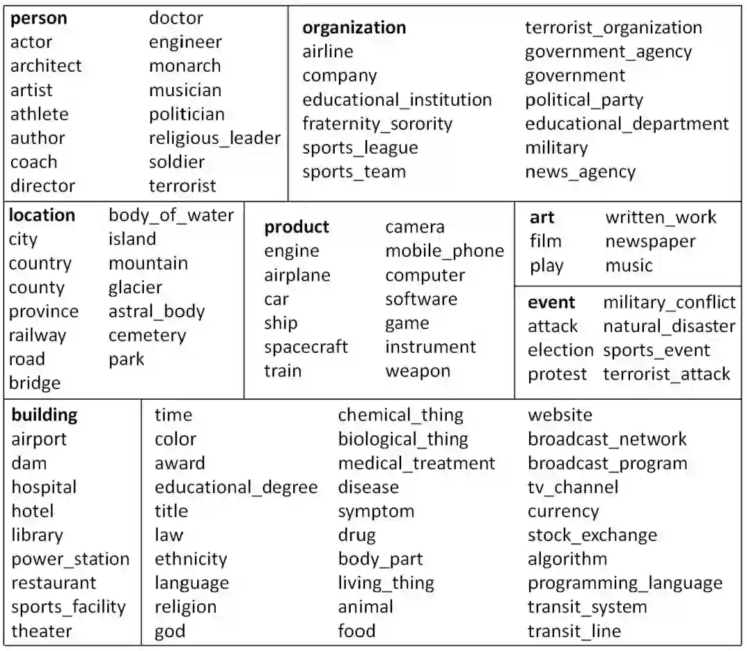 OntoNotes数据集参考了前面FIGER数据集的构造方法,同样从Freebase中筛选类别。类别之间的层次结构更加清晰。整个分类体系包含三层,比如person在第一层,artist在第二层,actor在第三层。并且最顶层的类别,和最常用的NER工具使用的类别集合可以对应起来。