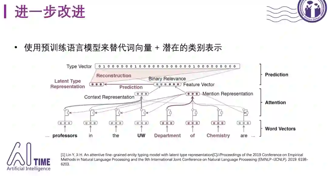 近两年来预训练模型发展迅速,也可以用到细粒度实体分类的任务中来。EMNLP-19提出的模型使用ELMo 和BERT 等更强的预训练语言模型进行mention 和context 的表示,模型顶部是一个混合分类器,它不独立预测每种类型,而是预测编码潜在类型特征的低维向量,并且该模型从这种潜在表示中重构稀疏高维的类型向量。这个工作使用了ELMo和BERT 等更强的预训练语言模型,结合潜在类型表示,效果进一步提升。