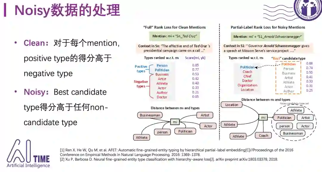 处理数据噪音的比较有代表性工作是EMNLP-16提出的AFET模型。这个模型分为四个部分,首先提取mention的特征,然后将训练数据集划分成clean set和noisy set。Clean set中的实体类别信息比较单一,只对应一条类别路径,而noisy set中的实体对应多条类别路径,这种数据就是包含噪音的。将mention和type映射到同一个语义空间中,方便后面做计算,U和V是映射矩阵,目标就是要学习这两个映射矩阵U和V。在得到了这两个矩阵之后,就可以为测试集中的实体mention预测类别。