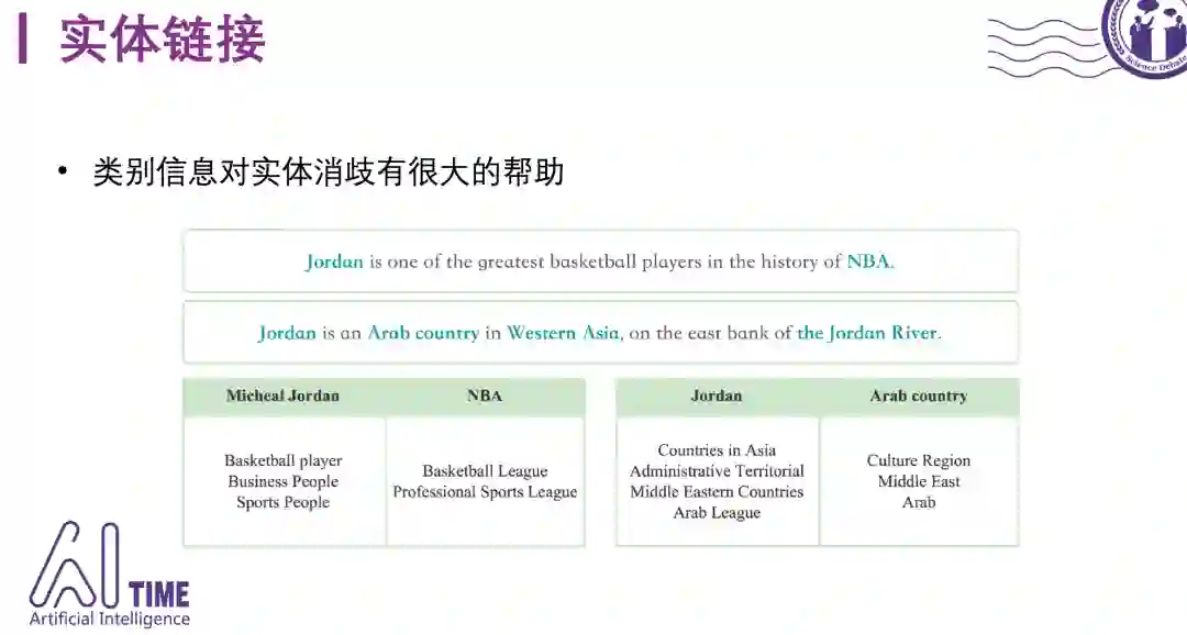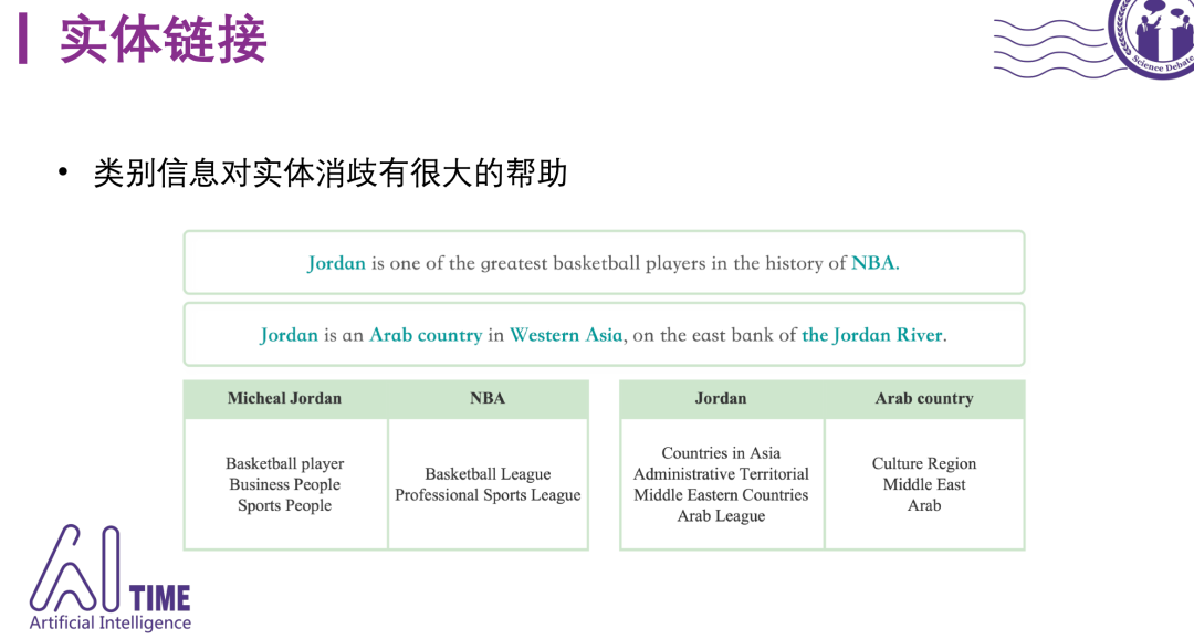 如图所示,对于第二个文档,能够判断出”Jordan(Country)” 的类别与文本中的另一实体”Arab country” 的类别语义接近,从而选择“Jordan(Country)”作为实体mention ”Jordan” 的指代的目标实体。