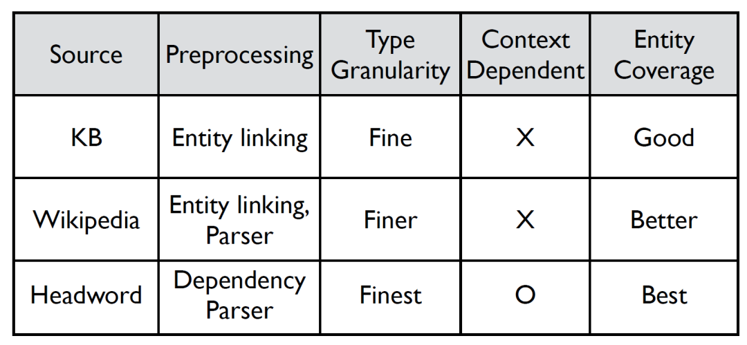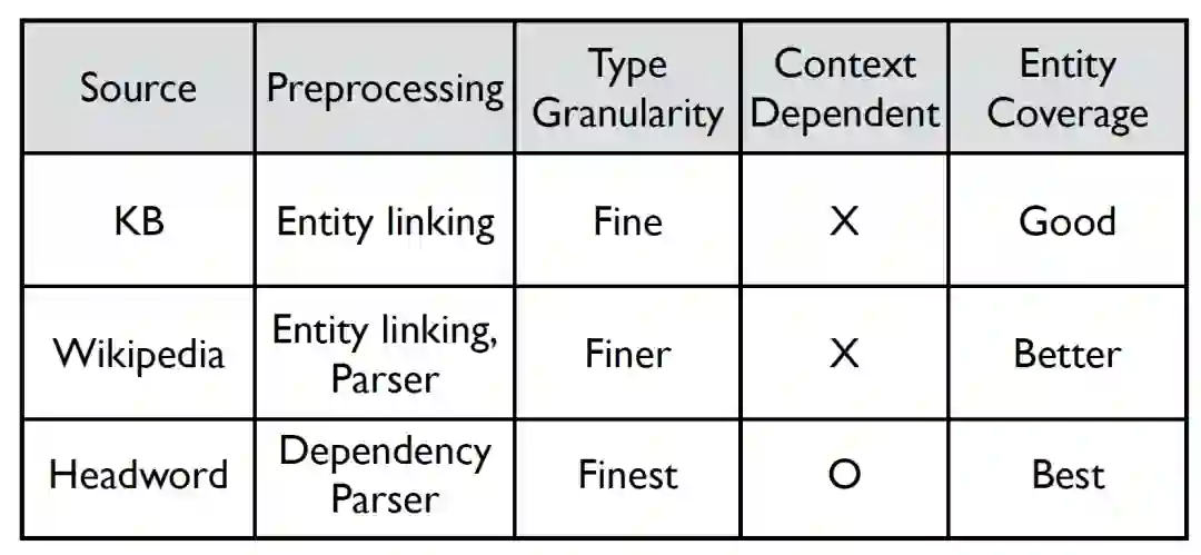 以上两种方法,都没有考虑mention所在的上下文,因此存在一定的噪音。使用中心词的方法可以得到最细粒度的类别,相对前两种方法而言是上下文相关的。