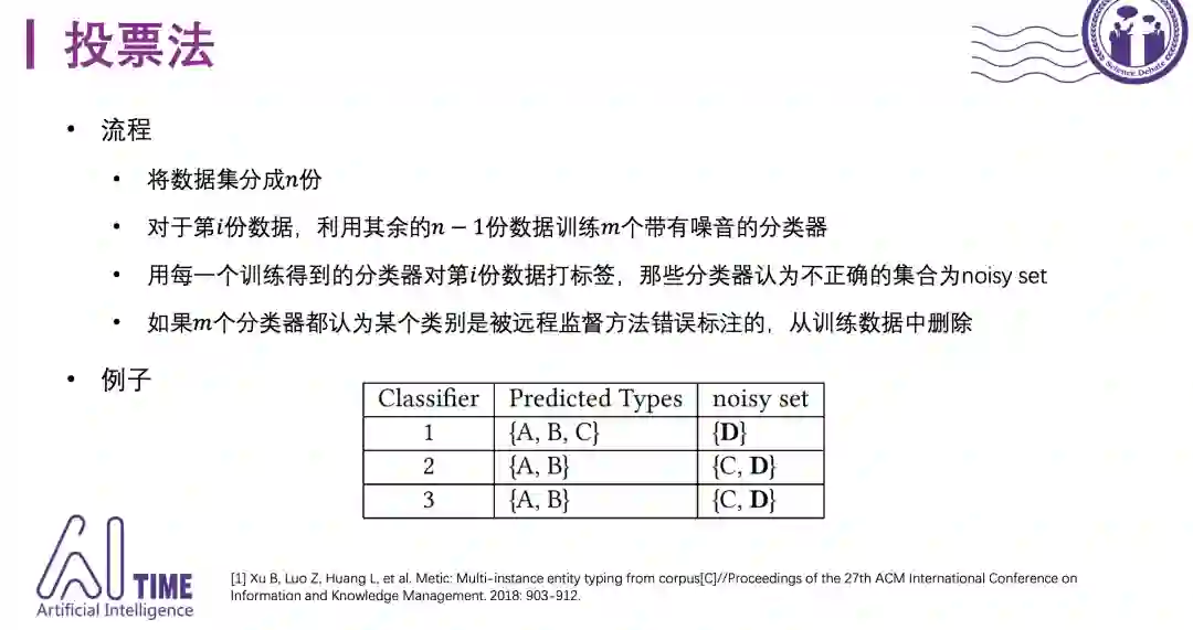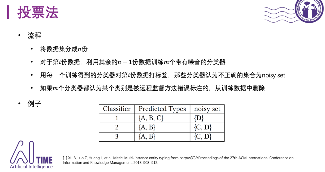 首先介绍一种最简单的数据降噪方法,称为投票法。如图所示,如果distant supervision的标注方法认为ABCD都是某个mention的类别,但是三个分类器都认为D是错误标注的类别,最终会将D删除。