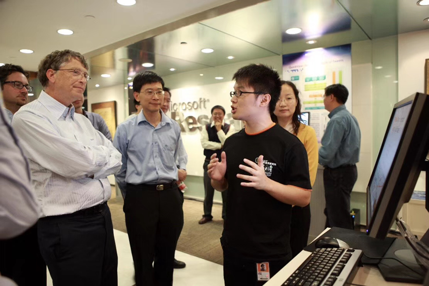 袁晶(前排右一)实习期间向比尔•盖茨介绍 T-Drive 项目