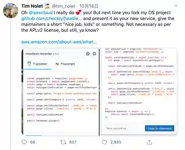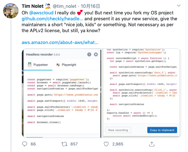 这种作法本身没有任何问题——毕竟 Nolet 的软件遵守 Apache License v2,开发者们也希望看到自己的成果能够得到广泛应用。但 Amazon 的行为确实值得商榷,因为他们甚至没有公开提到这部分代码的真正创造者。在 CloudWatch 扩展中的一个 NOTICE.txt 文件倒是稍微说明了一下,但提及的并非 Headless Recorder,而是其之前的曾用名“puppeteer-recorder”,而且完全是为了满足开源许可的要求。