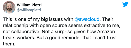 一位名叫做 William Pietri 的开发者和企业家说:“这是我与 @awscloud 之间的一大主要矛盾。在我看来,他们与开源社区的关系更多是种粗暴索取,而非健康协作。考虑到 Amazon 对员工的残酷压缩,这倒也不足为奇。但这种种行为实在令我无法信任他们。“