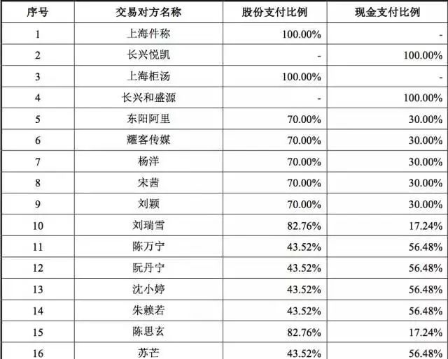 其中以16.7亿元的价格收购悦凯传媒100%股份,其中贾士凯持有公司约51.25%,拥有绝对控股权;而杨洋和父亲杨国平共计持有27.22%的股份;宋茜、颖儿分别持有0.85%。
