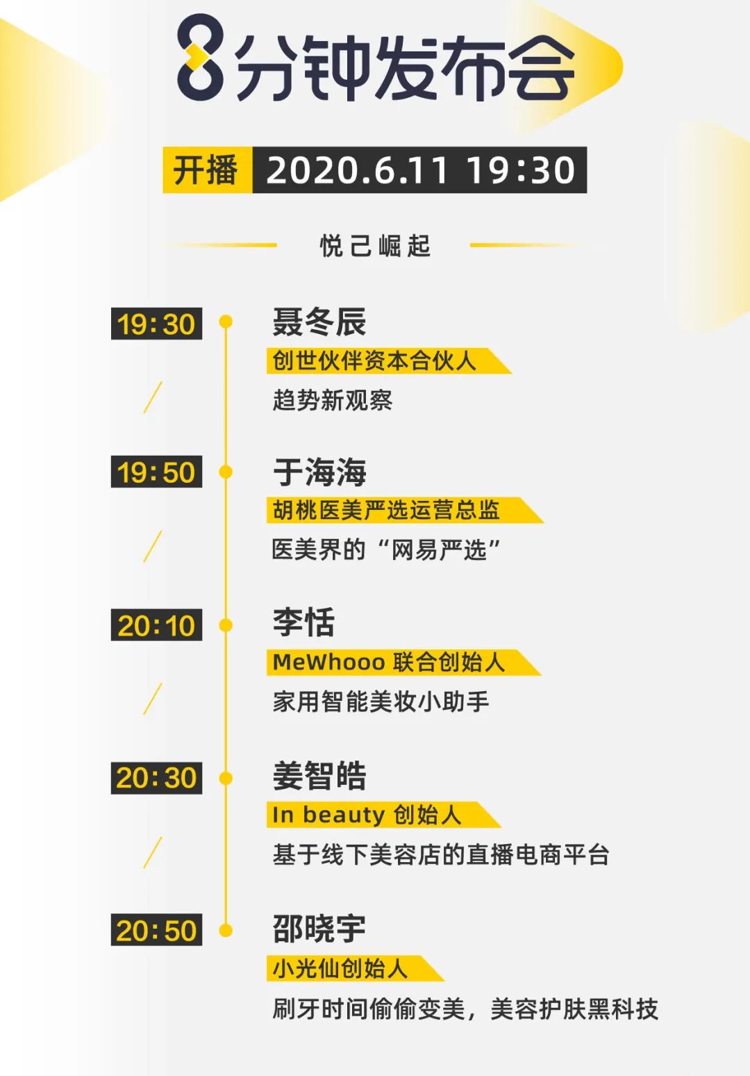 聂冬辰坐镇,胡桃医美严选 运营总监 于海海、个护美妆定制平台MeWhooo 联合创始人 李恬、美容电商直播平台In Beauty 创始人 姜智皓、美容护肤黑科技小光仙 创始人 邵晓宇,将来到36氪未来直播室发布自己的创业项目。