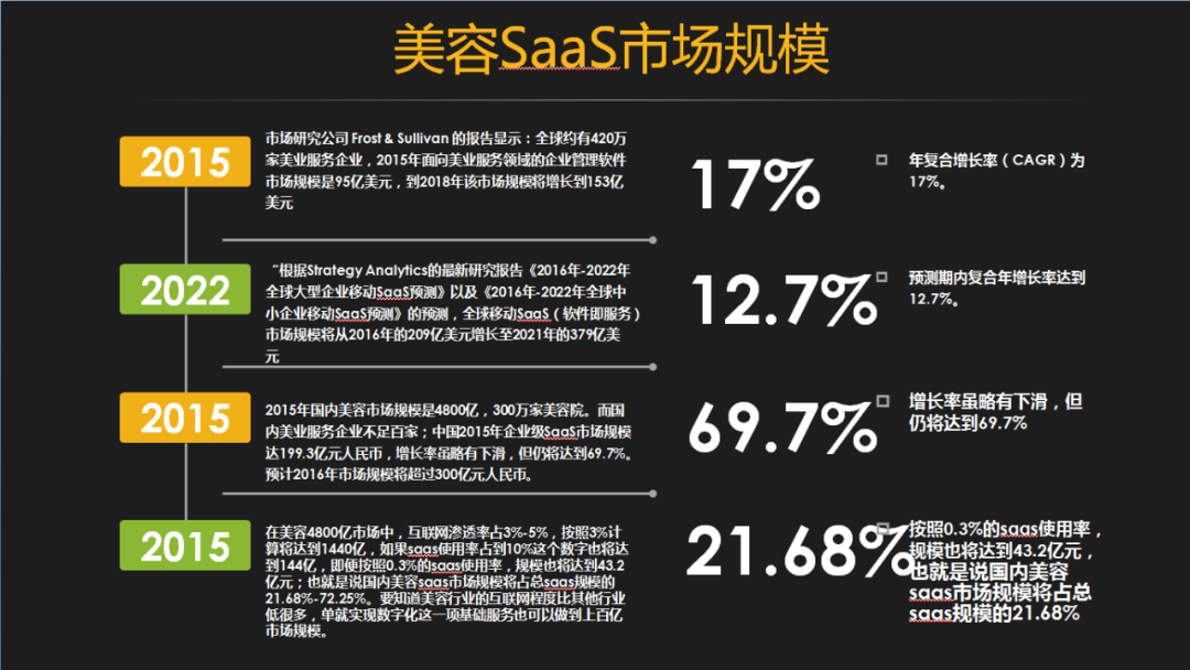 依托技师技术和服务开展的美业线下门店,营销活动也受限于中小型美业门店的推广营销能力,仅限于口碑传播和朋友圈店铺自有微信发布广告的封闭壁垒。随着SaaS + Supply chain + Service 的 3S 模式逐渐深入美业,美业SaaS平台业务也不断垂直细分。