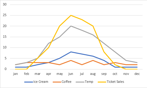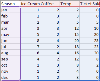 从下表中我们可以看到,夏季的门票明显比其他季节好卖,而冬季卖不出一张票。咖啡销量整年中比较稳定,冰淇淋则一年之中都有销量,但旺季是 6 月。