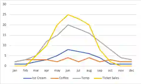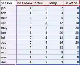 比如说我们要预测水上公园的票价走势;为此我们决定查看天气数据、冰淇淋销量、咖啡销量以及季节状况。
