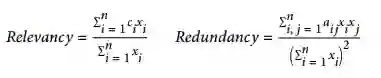 将所有的想法整合起来就能得出我们的算法,即 mRMR 特征选择。算法背后的考虑是,同时最小化特征的冗余并最大化特征的关联。因此,我们需要计算冗余和关联的方程: