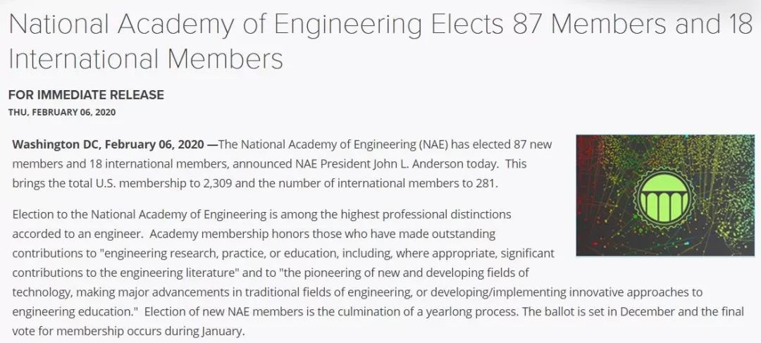 参考内容:https://www.nae.edu/224584/National-Academy-of-Engineering-Elects-87-Members-and-18-International-Members-