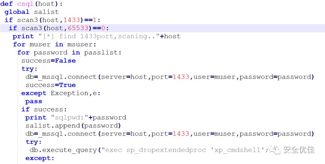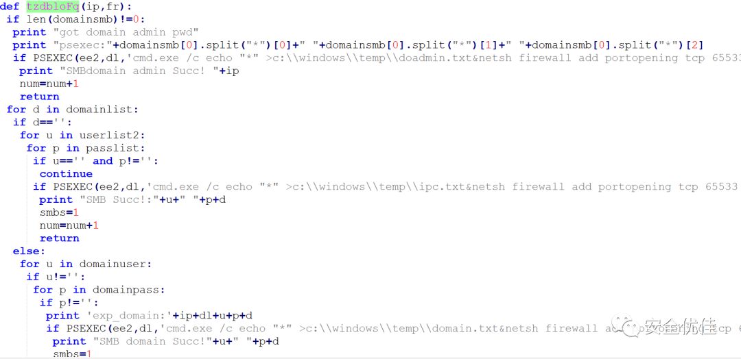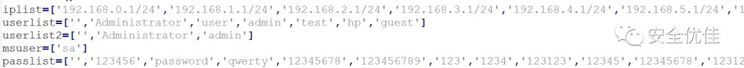 之后就是攻击传播的部分,病毒内置的攻击IP段、弱口令账号密码列表。
