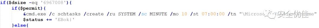 判断下载的文件大小是否正确,如果正确则创建计划任务运行此exe,根据不同的权限使用不同的方法运行,如果是管理员权限,直接创建计划任务运行此exe。