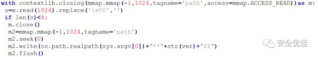 去混淆后,可以看到最终的病毒代码,病毒最开始会通过内存映射,检测当前版本。首先打开内存映射读取内容,如果没有获取到映射的内存,则创建内存映射将自身的路径+“**”+当前版本号+“$$”写入到新创建的内存映射中。