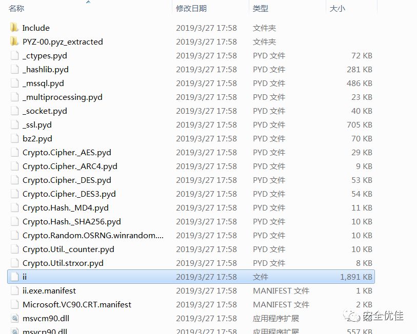 4)如果配置文件kk4.log不存在,则下载ii.da,并使用4-8位随机字母命名,例如 hjqgbs.exe,此模块就是之前的攻击模块,使用Python开发,使用pyinstaller打包。
