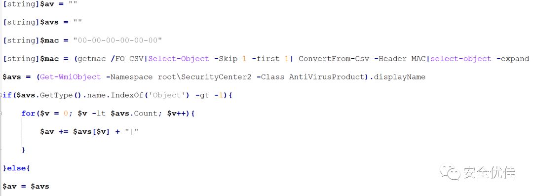 最终解密出下载脚本,脚本运行后首先获取本机网卡mac地址,获取本机安装的杀毒软件信息。