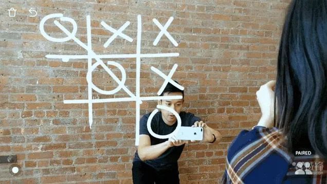 前面那么多内容其实大多数都是和人工智能技术相关的,但对于前几年大热的 VR\AR 技术谷歌也没有放弃。在最新版的 ARcore 中,用户能够和朋友分享在环境中标定、创造的对象,比如和朋友一起玩 AR 井字游戏。
