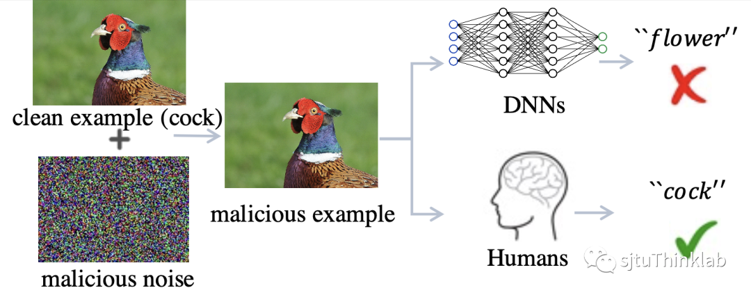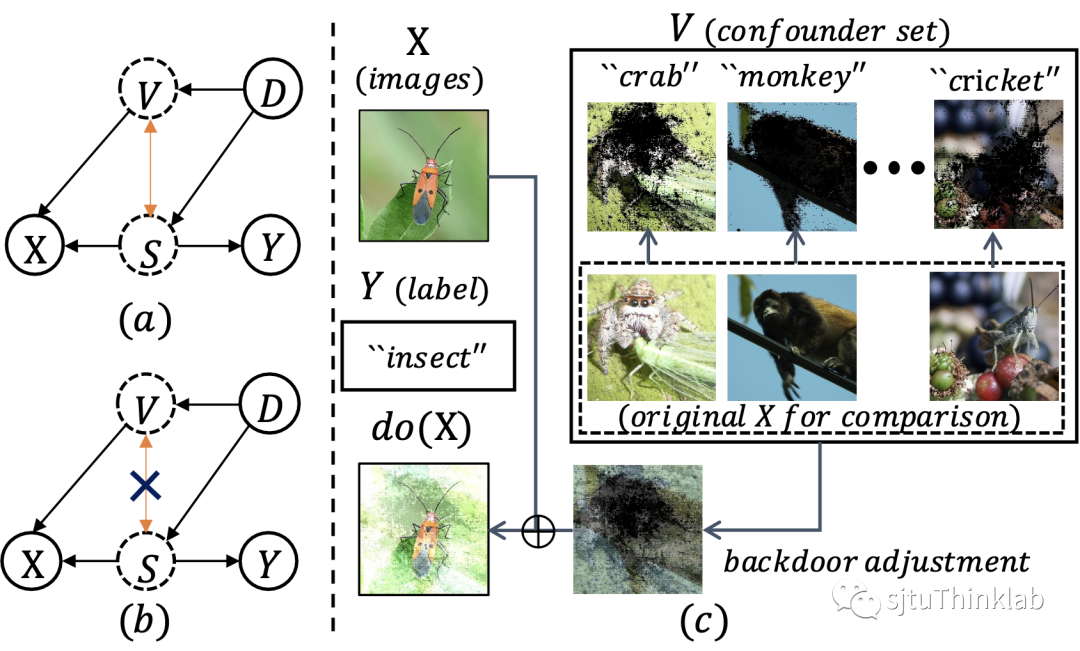 即使两种攻击手段通过造成测试域或者训练域的域偏移 (domain shift)在深度神经网络 (DNNs)上取得了很好的效果,然而它们并不会影响人类判断 (图 1)。对此一种流行的假设是人类认知系统能够捕捉到图像和标签中对域偏移保持不变的因果联系,而DNNs为了达到人类设置的监督目标,倾向于利用数据和标签之间所有的相关性来拟合数据,其中就可能有虚假的相关性,比如一张图像为草地上的鸡,草地并不是决定该图像标签 (鸡)的决定性因素,但是因为其在类别为“鸡”的图像里经常出现,所以容易被神经网络利用来做决策。因此,有理由认为攻击者的成功在于利用了这类虚假因子,造成训练数据和测试数据间的域偏移,使之不满足独立同分布 (IID)假设,降低模型的泛化性能。