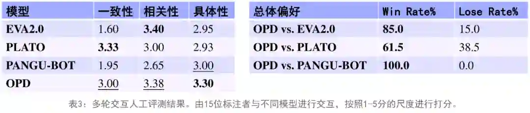 我们还招募了 15 位标注者进行了多轮交互式人工评测。每位标注者需预先选定 3 个话题及对话开头,分别和各个中文对话模型进行对话,我们要求每次对话的轮数至少为 16。标注者在交互后根据一致性、相关性和具体性三个维度按照 1-5 分的尺度进行打分,并按照总体质量对不同对话模型在同一个对话开头的表现进行偏好选择。交互式评测的结果和静态评测相似,OPD 在具体性和总体质量上显著超过了所有基线模型,而在一致性和相关性上与最优基线模型表现相近。