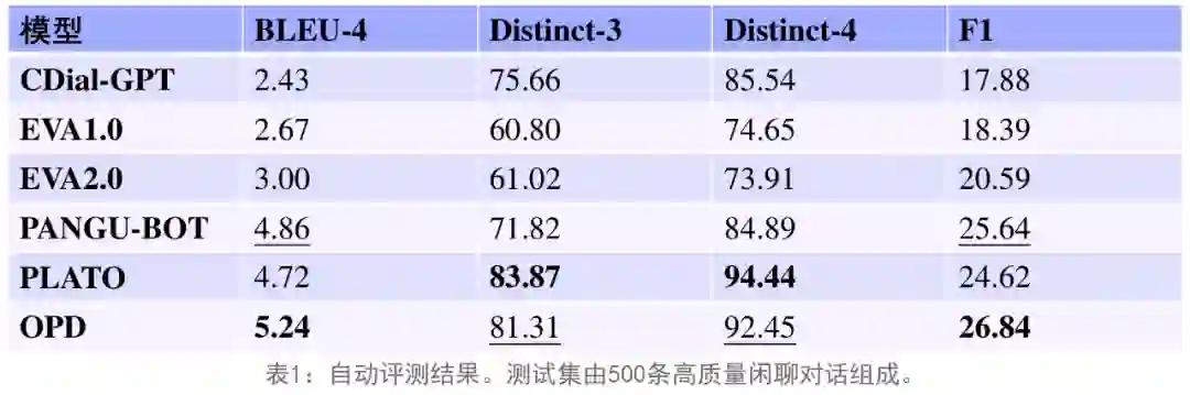 我们构建了包含 500 条对话数据的高质量评测集,并首先在该评测集上进行了自动评测。OPD 在 BLEU-4 和 F1 等自动指标上均能达到现有中文对话模型的最优性能,同时在多样性指标 Distinct-3/4 上也能达到与 PLATO 相近的性能。