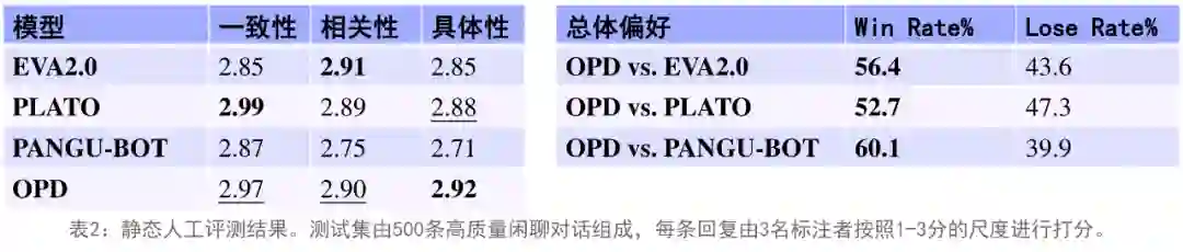 高性能:我们通过自动评测和人工评测来全面评估 OPD 的性能。评测结果显示,OPD 兼顾出色的闲聊能力与知识问答能力。得益于此,OPD 的多轮交互能力尤其突出,能够与用户进行多轮、深入的对话交互,性能显著优于 EVA2.0, PLATO 和 PANGU-BOT,更受用户偏爱。