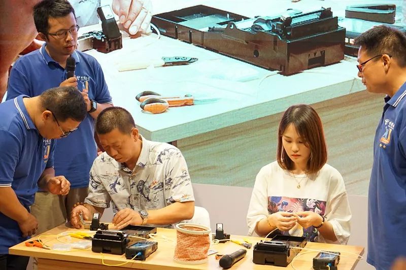 瞿宏德(左三)在徐珺(左二)和同事的指导下现场体验光纤熔接