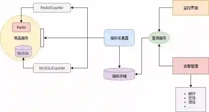 微服务架构中组件繁多,各个组件所需要监控的指标不同。比如 Redis 缓存一般监控占用内存值、网络流量,数据库监控连接数、磁盘空间,业务服务监控并发数、响应延迟、错误率等。